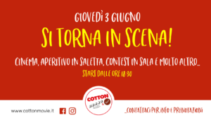 Giovedì 3 giugno si riaccendono gli schermi del Cotton Movie, insieme alla possibilità di sedersi a tavola e cenare in sala nella zona Food.